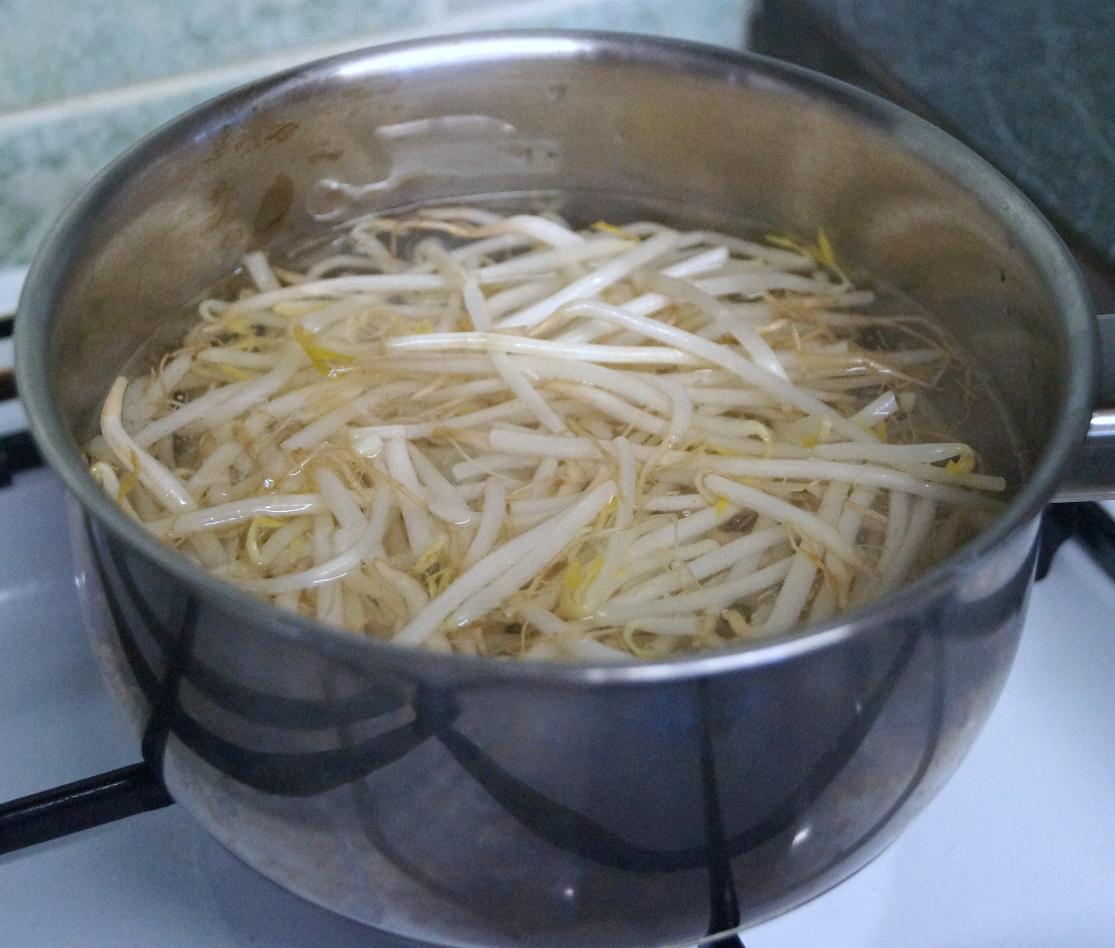 For a bit of crunch we parboiled beansprouts in a saucepan of hot water.