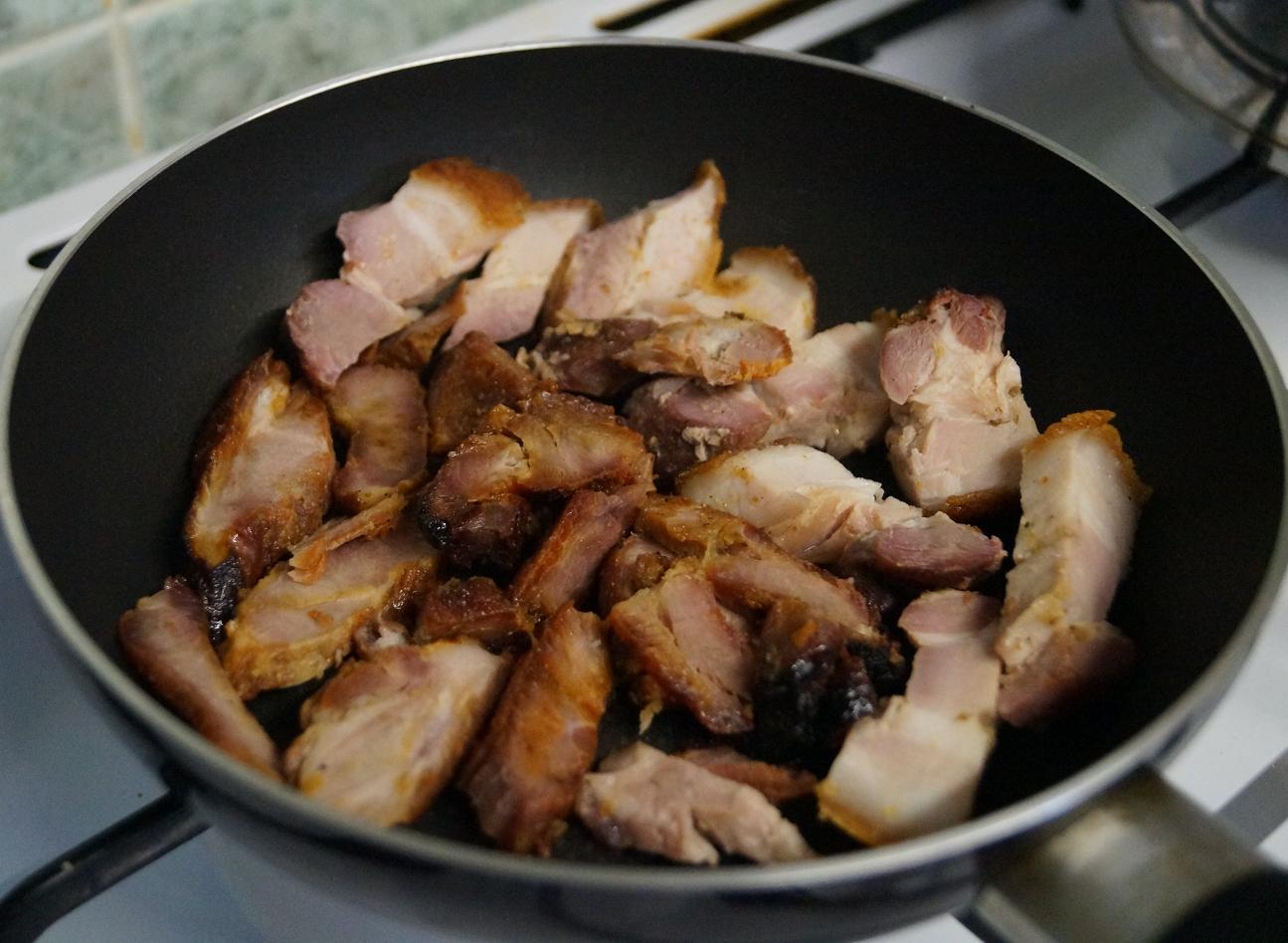 We stir-fried the meat in a frying pan. As the pork has already been cooked, it only takes a few minutes to go crispy and slightly caramelised.