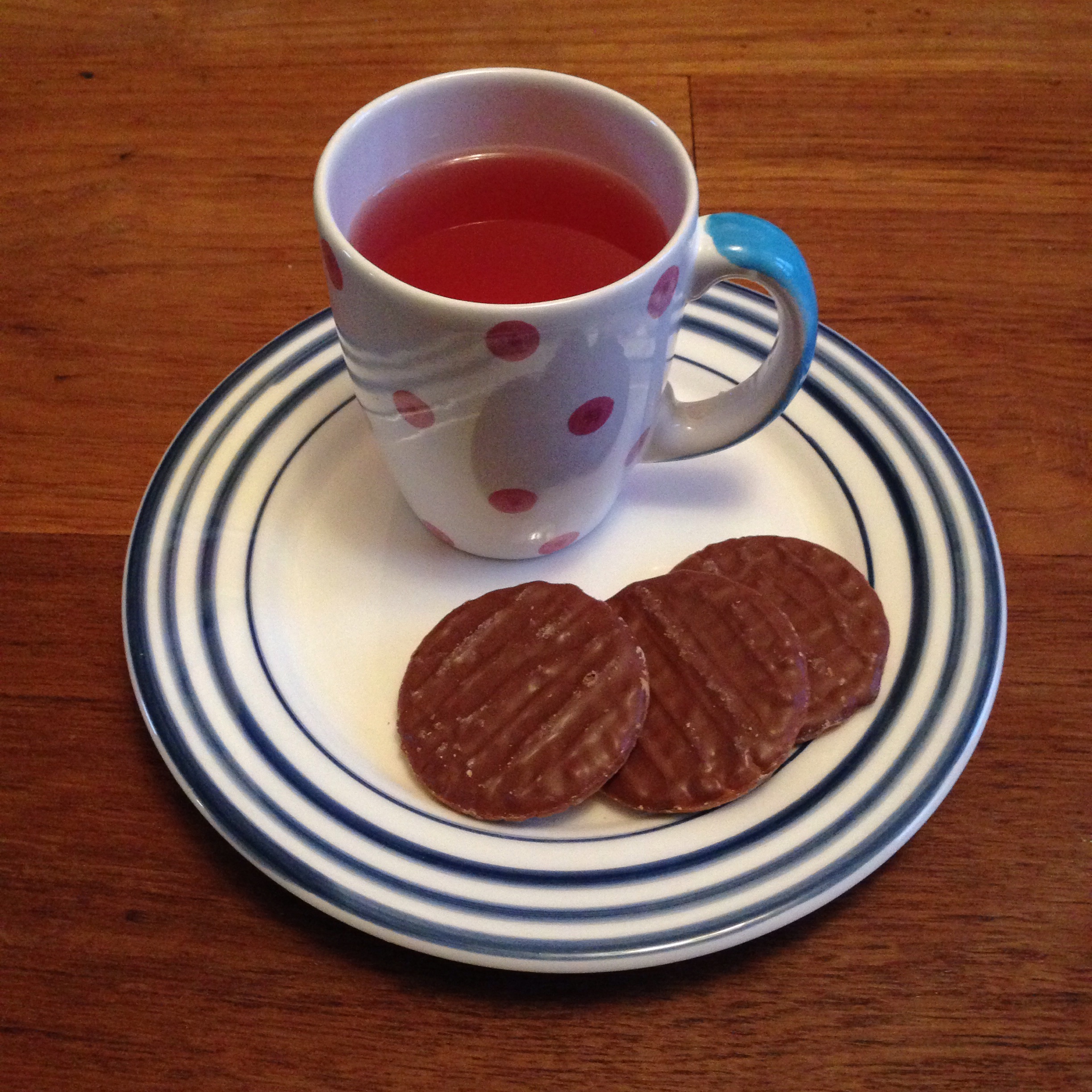 A bit of a naughty snack really but I had a couple of caramel digestive biscuits with Twinings Cranberry and Blood Orange herbal tea.