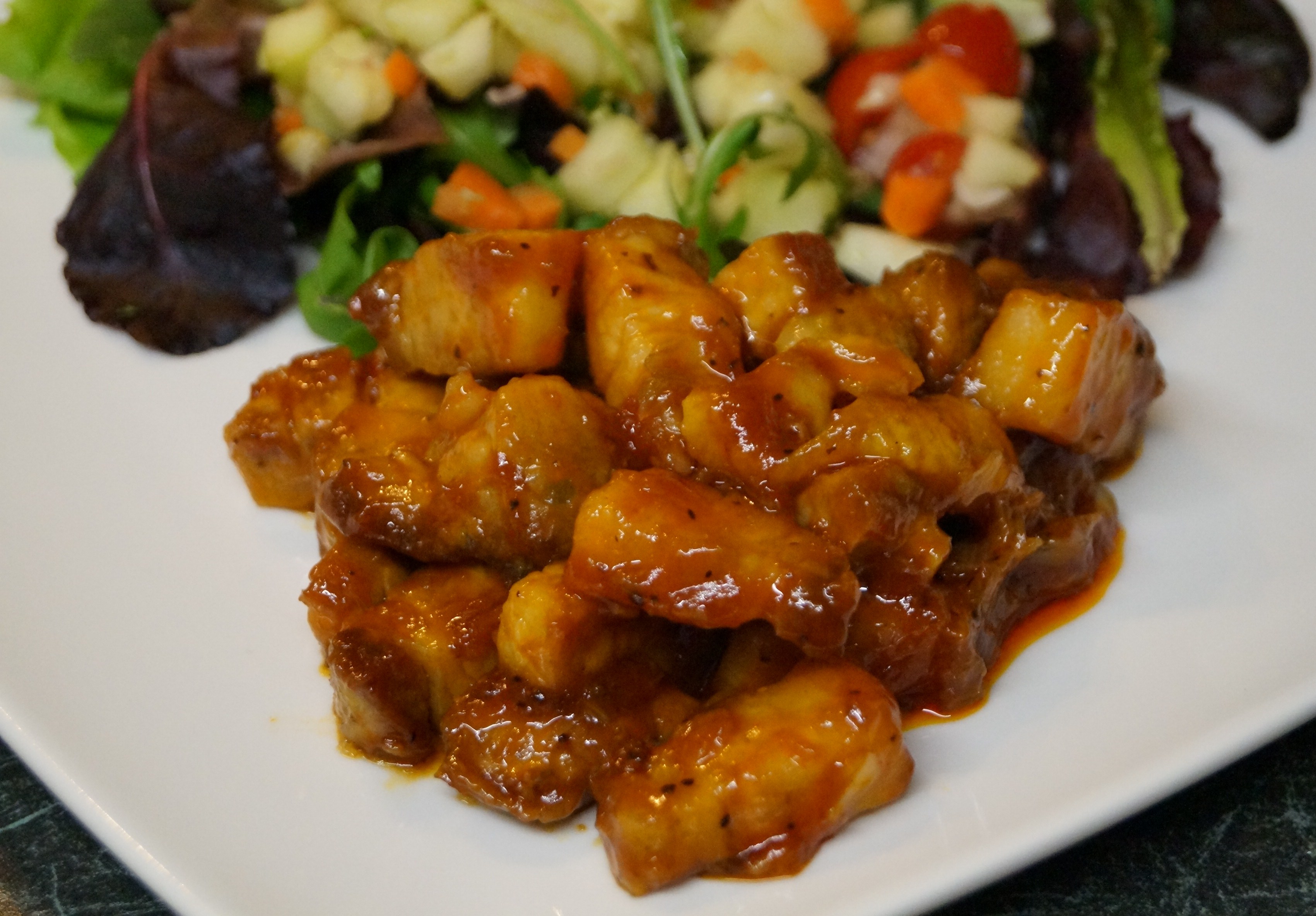 The first part of this dish is a sauce recipe my mum created over fifteen years ago. She wanted to make something new and different as a starter for our regular customers at the family’s restaurant. She made a sticky, barbecue, garlic sauce which she poured over crispy chicken wings (the consistency of the sauce is like ketchup). Yesterday, we chose to coat pork, instead of chicken wings, which had been fried in a pan with vegetable oil.