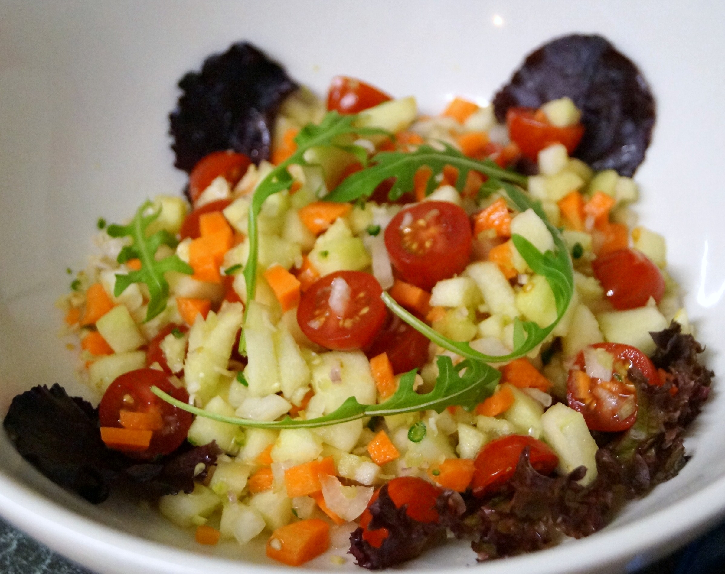 To complement the sweetness and slightly thick texture of the garlic sauce, we had a side salad with a slightly tart Granny Smith apple, the crunch from raw, diced carrot and zesty flavours of lime juice. We added cherry tomato and salad leaves for bulk and a small chilli for spice.