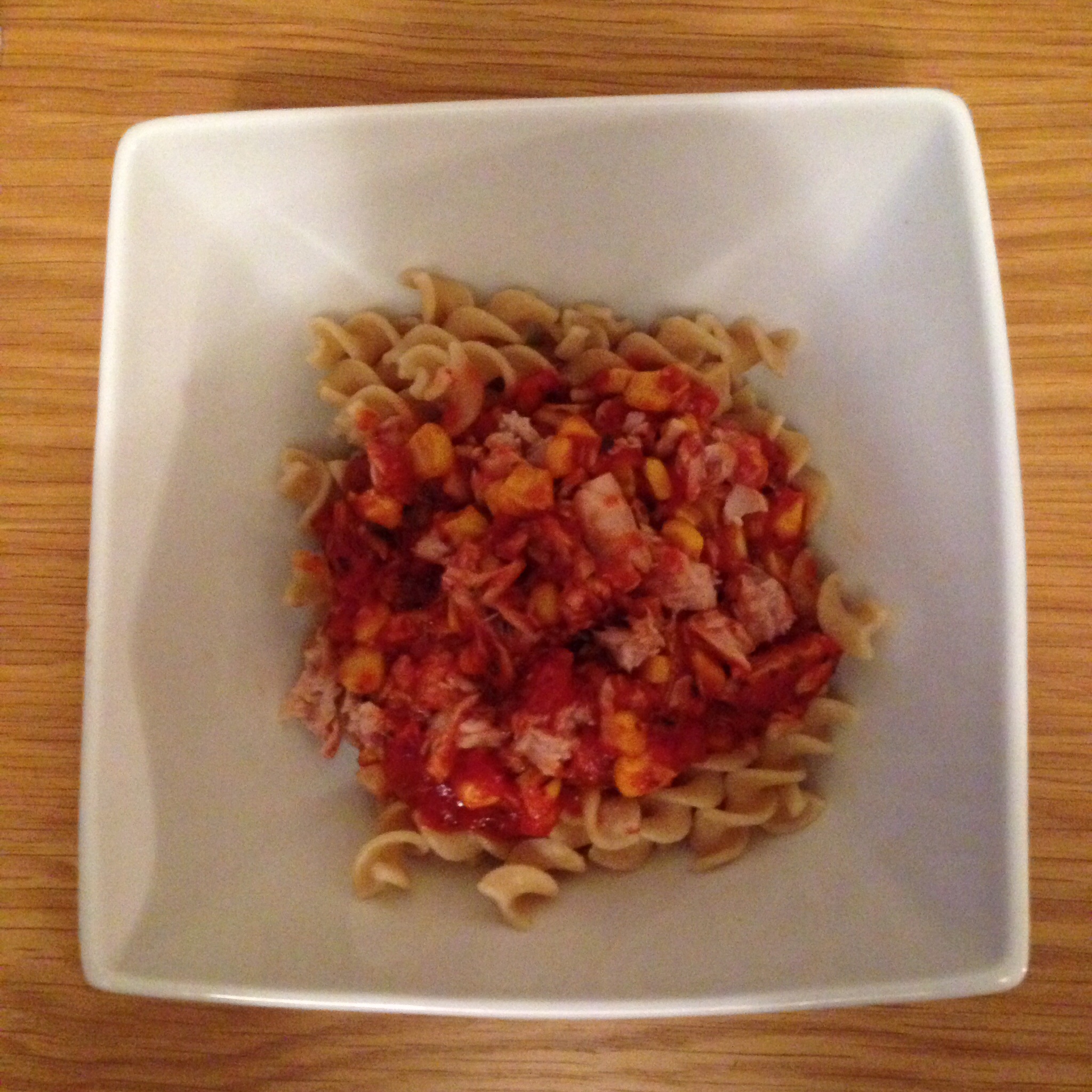 I fancied a few carbs at lunch and chose something my daughter could eat too. We had organic wholewheat fusilli pasta with tuna chunks, a bolognese sauce, peas and sweet corn (although you can’t see the peas in this photo). I tend to mix in regular fusilli as Annabelle can be fussy but because we ran out, we just had wholewheat pasta and she didn’t even bat an eyelid.