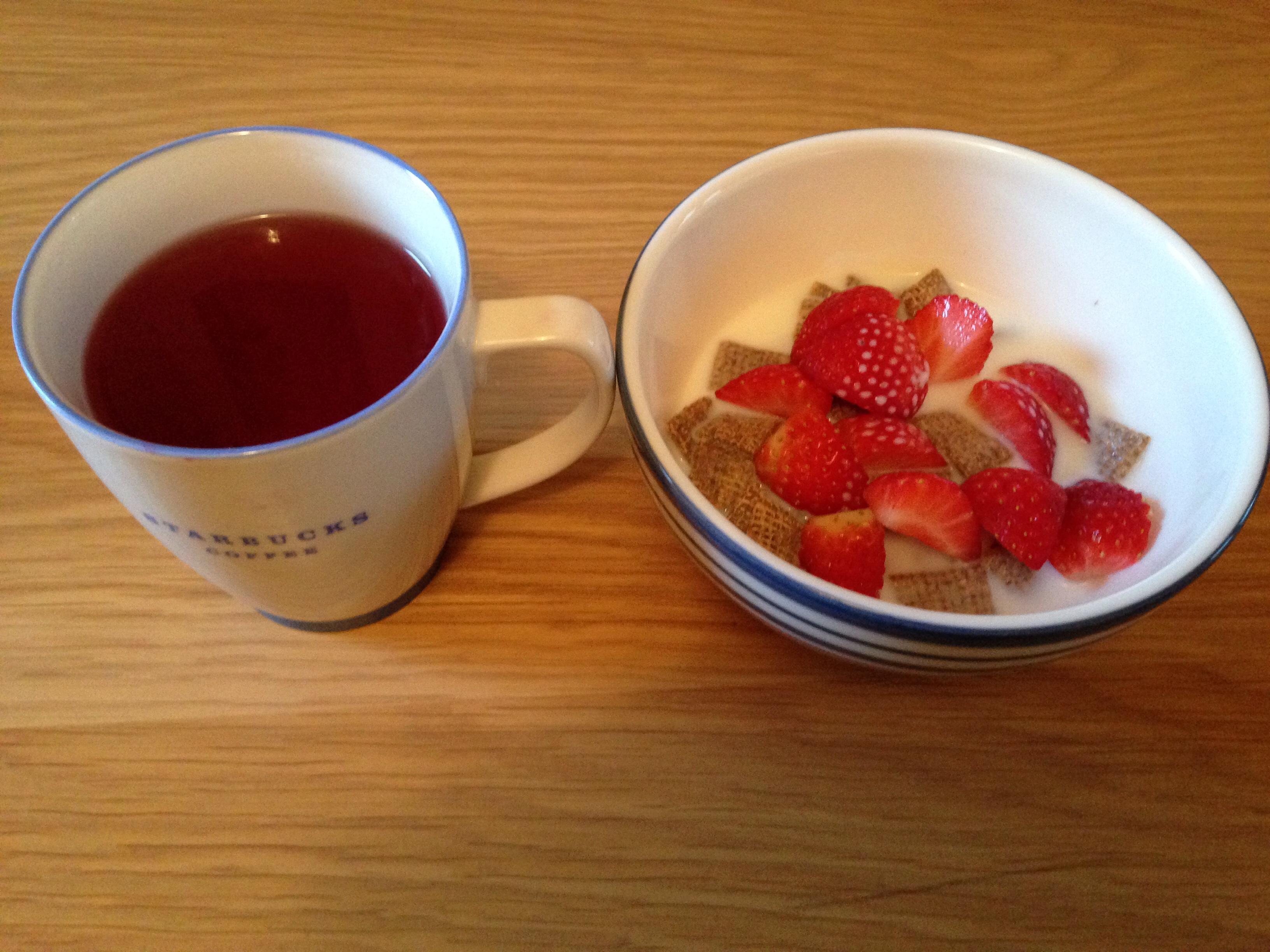 Shreddies with fresh strawberries and semi skimmed milk. I had a Caramelito Nespresso with hot soya milk followed by a Twinings Cranberry and Blood Orange herbal tea.
