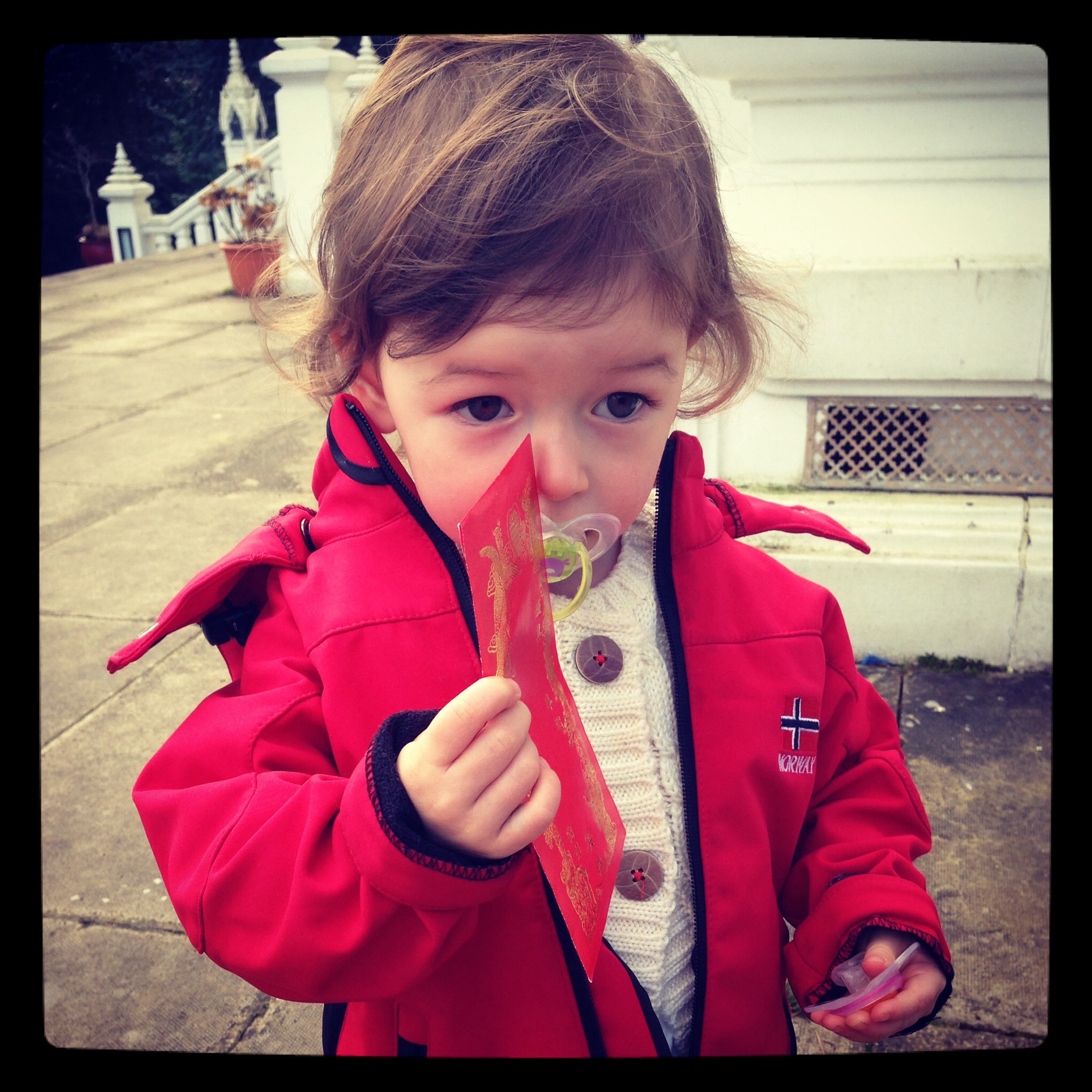 In Chinese tradition, children receive a red envelope with money to bring good luck for the New Year. My daughter received hers at the temple. Hopefully this will bring twice as much luck!
