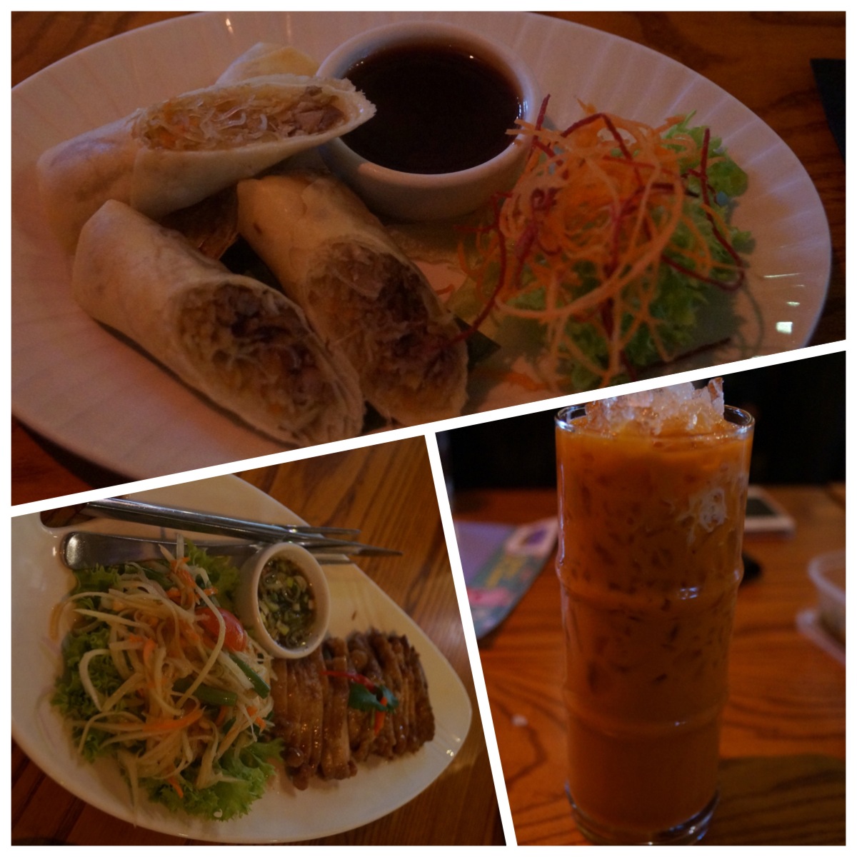 We chose a selection of dishes from the lunch specials and à la carte menus. We ordered duck spring rolls, Thai ice tea, and Gai Yang (barbecued chicken) with Som Tum salad (papaya salad) and sticky rice.