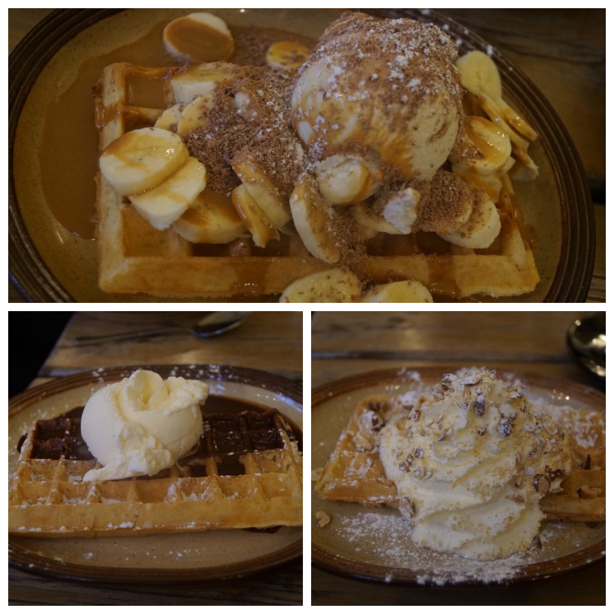 We had three waffles between the six of us. I shared a banoffee waffle with my mum. It came with banana, toffee sauce and flaked chocolate. The vanilla ice-cream was extra. We ordered it instead of whipped cream as we hoped Annabelle would have some, but as I mentioned in my New Year’s resolution post, Annabelle has very fussy eating habits and it was down to my mum and I to finish it. She doesn’t have much of a sweet tooth (the opposite of me!) and went off any kind of chocolate for several months. She only eats ice-cream in a cone and only if she’s in the mood for it.