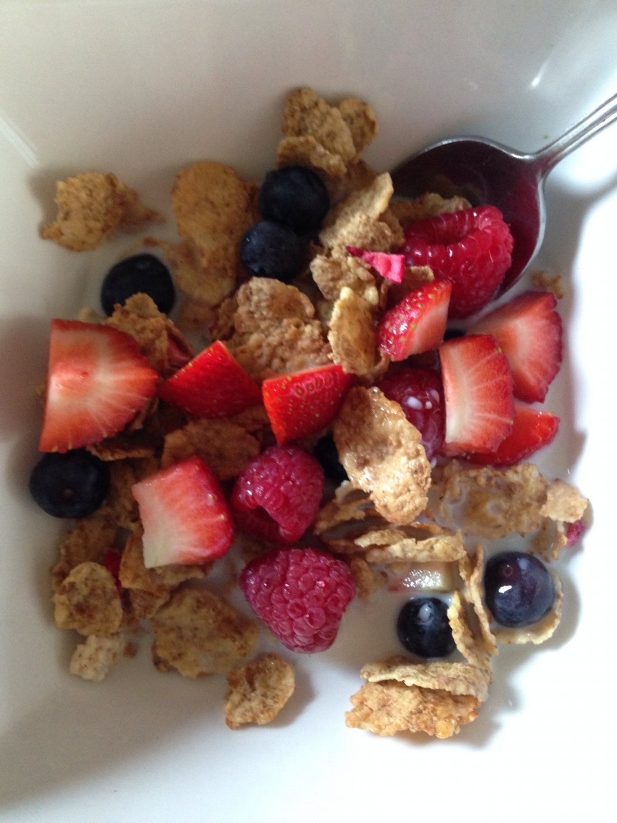 Special K Creamy Berry Crunch with semi-skimmed milk and fresh blueberries, raspberries and strawberries. This is one of my favourite cereals as I love the little vanilla flavoured clusters. I had a cup of Sainsbury’s Fairtrade tea with semi-skimmed milk.