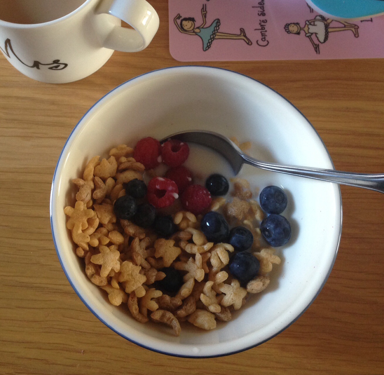 Multigrain Rice Krispies with semi-skimmed milk and fresh blueberries and raspberries. We ran out of my cereal and so I had to have some of Annabelle’s. When I bought the Rice Krispies, I didn’t realise that it was sweetened. Annabelle only has it as a treat every now and again as I don’t really like her to eat sugary cereals. She likes it dry without milk. I drank a cup of Sainsbury’s Fairtrade tea with semi-skimmed milk.