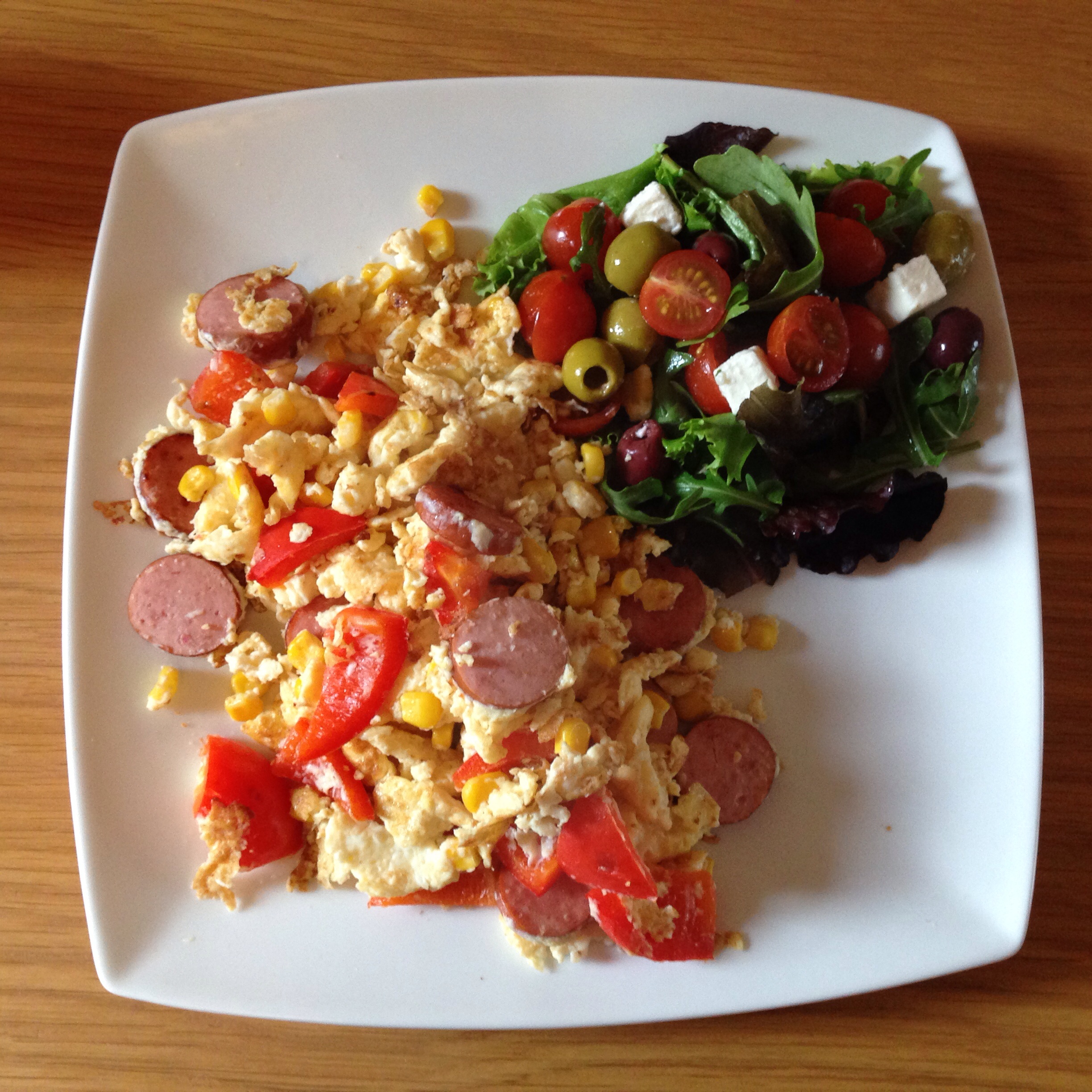 A cheddar cheese, sausage, red pepper and sweet corn omelette with olives, tomato and feta cheese side salad. Well, I say it was an omelette but our pan isn’t very ‘non-stick’ any more. It’s about 10 years old (no joke) and I really need to get rid of it. I had a few different leaves including rocket.
