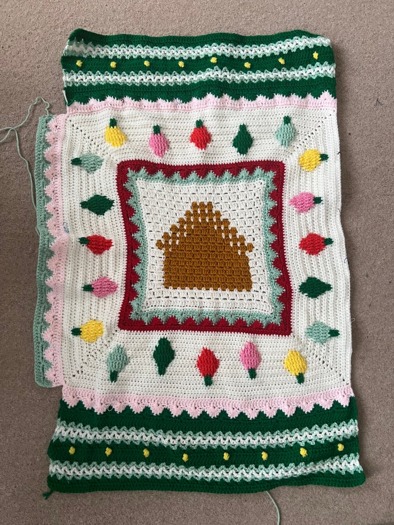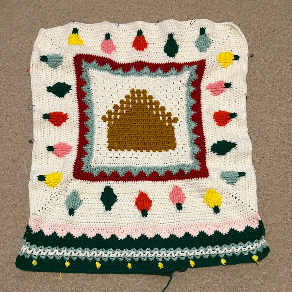 At the beginning of the month, I was working on the lights surrounding the gingerbread house (pictured above). I am now working on the jumper panels (pictured below, which is the section below from the pink stripe down).