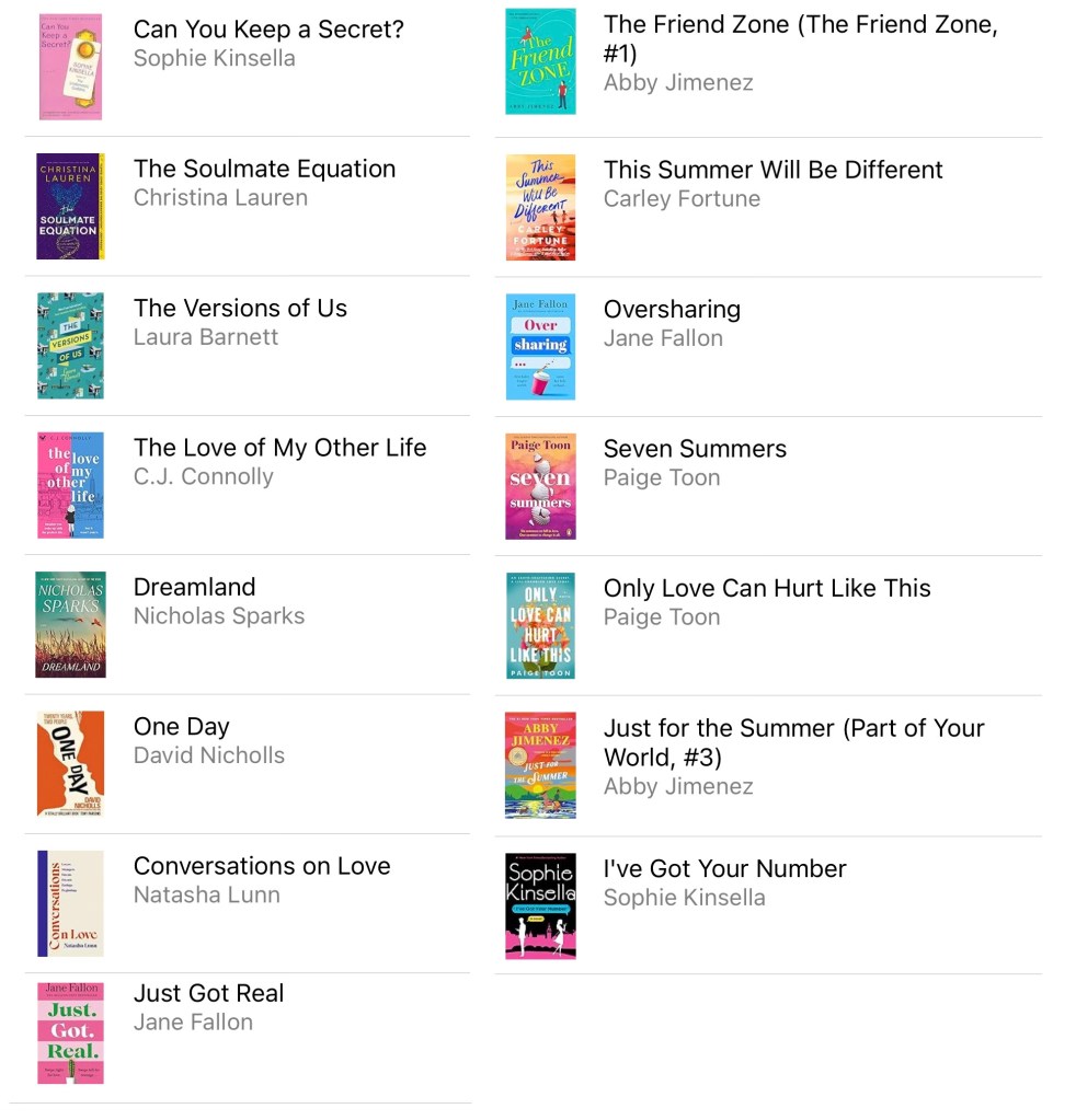Of the 15 I have read this year, my top three, in no particular order are: the Soulmate Equation by Christina Lauren, Just for the Summer by Abby Jimenez and Only Love Can Hurt Like This by Paige Toon. These books tick practically all my boxes. My least favourites were Dreamland by Nicholas Sparks and The Versions of Us by Laura Barnett, probably as they are completely out of my comfort zone. As mentioned in one of my recent posts, I want to read fiction that makes me reflect on life a bit more but I found I struggled with these two.